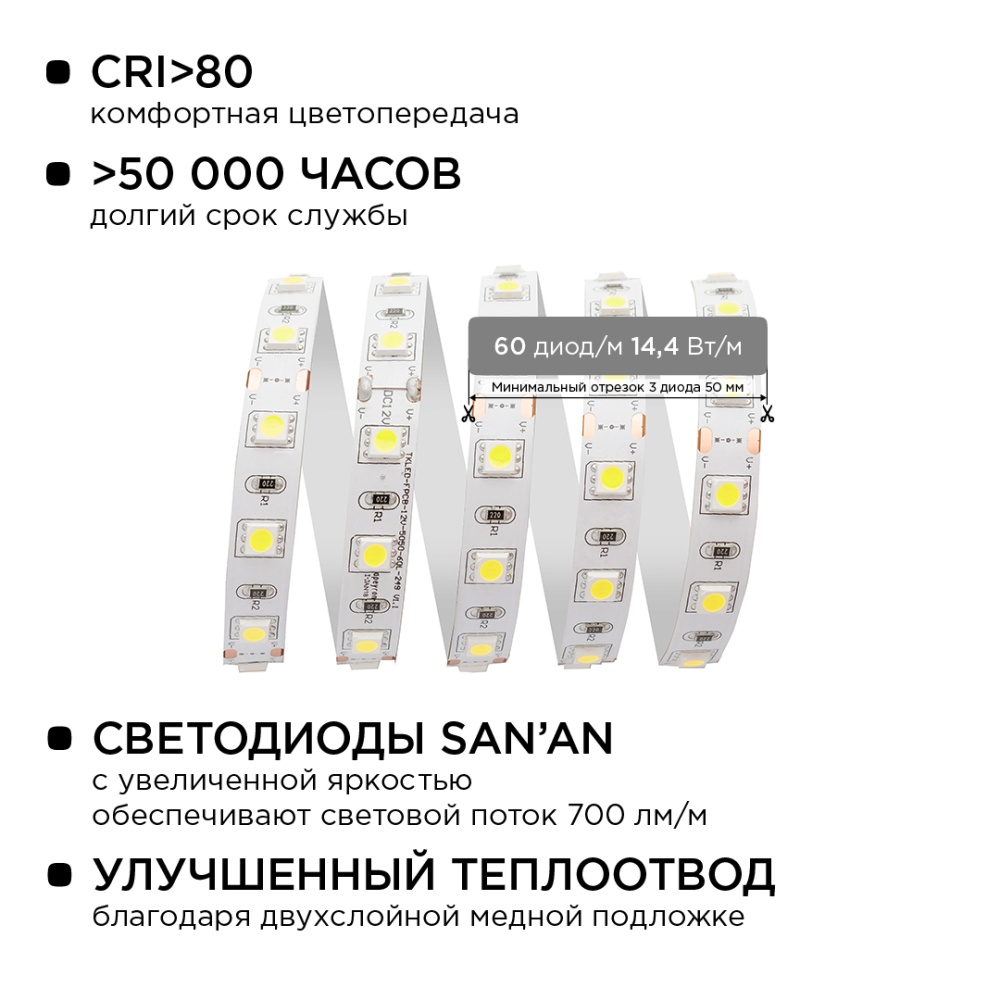 Комплект светодиодной ленты Apeyron 12В 144Вт/м smd 5050 60 д/м IP20 1м 6500К (блок, коннектор) 10-67