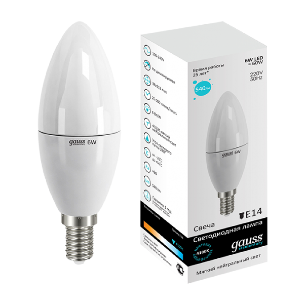 Лампа светодиодная Gauss E14 6W 4100K свеча матовая LD33126